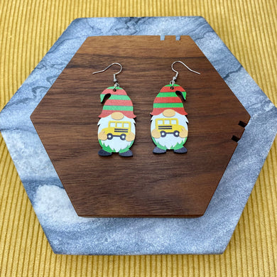 Wooden Dangle Earrings - Teacher Gnome Bus