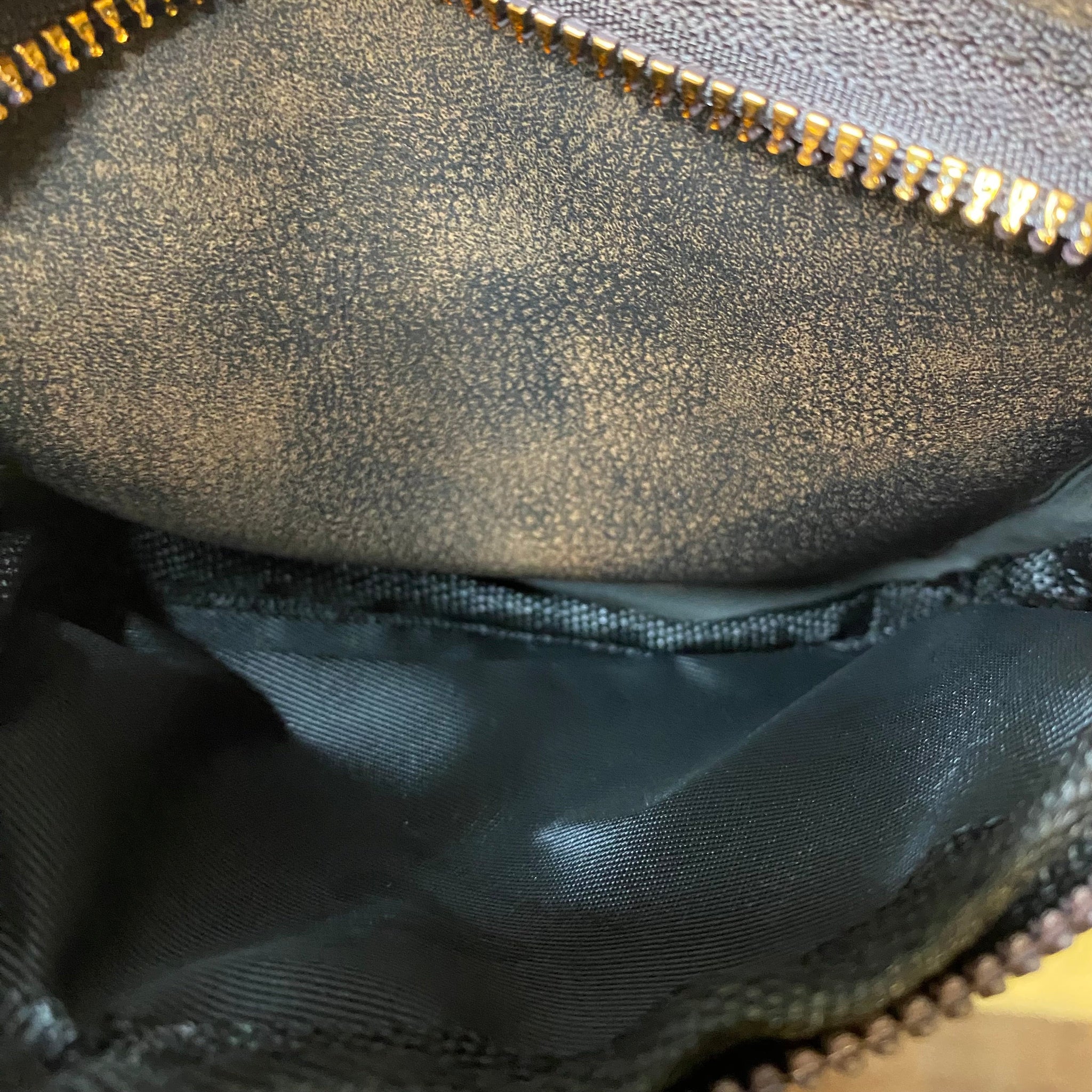 - Faux leather material with fabric strap and nylon-like interior liner.